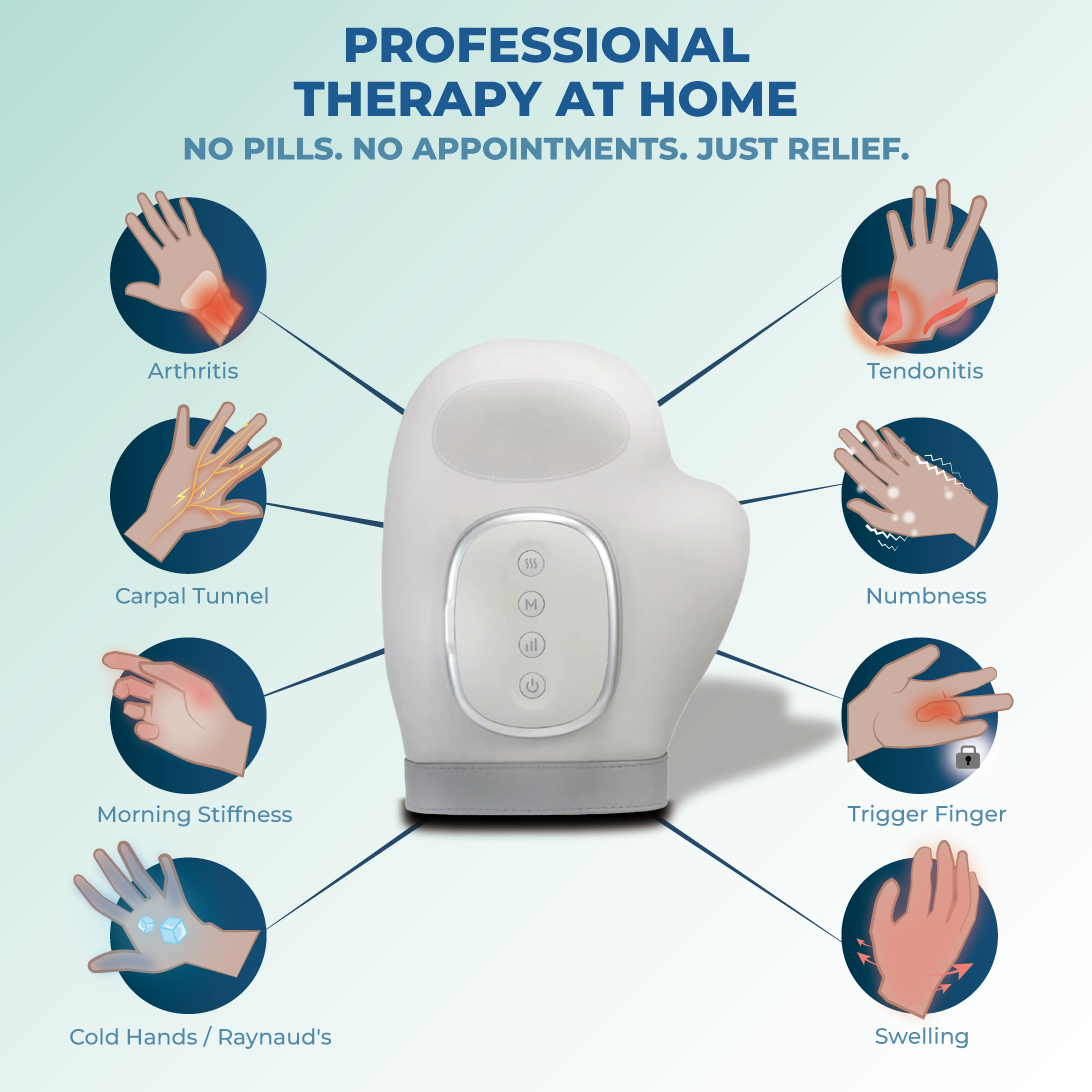 You are in full control. We designed it with a "Safety Release" feature. If the pressure ever feels too intense, simply press the power button, and the airbags deflate instantly (in under 2 seconds), releasing your hand immediately.